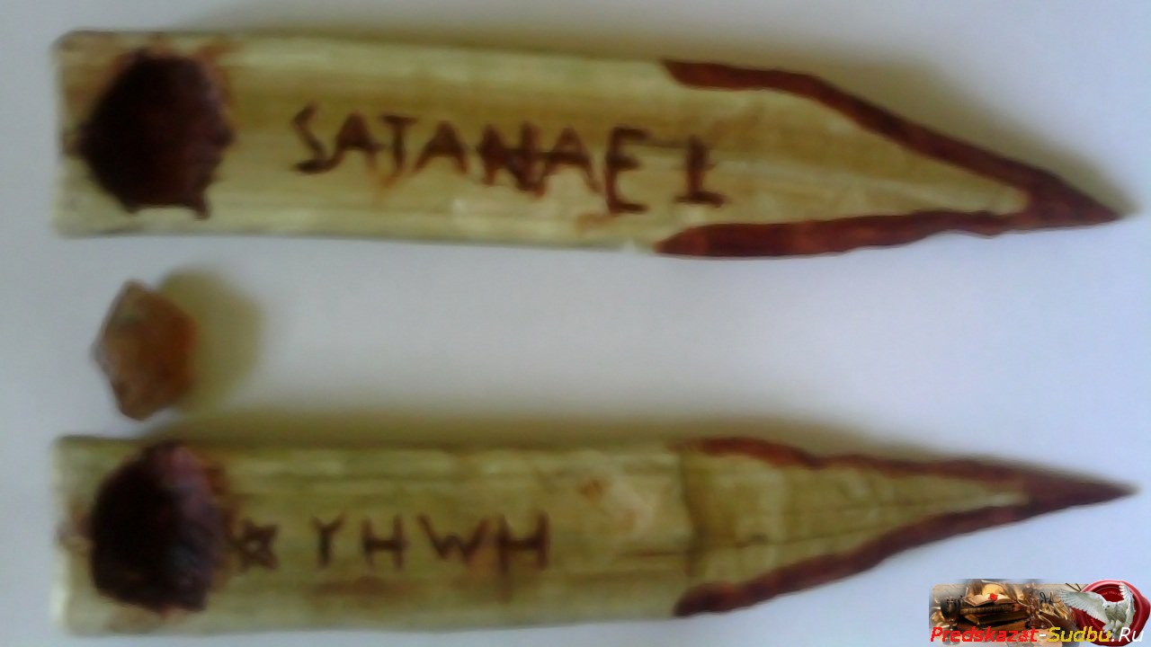 Процесс: Возьмите обработанную ветвь дерева нужного диаметра и длины (Так, чтобы при продольном разделении на две части, будущие "Клинки" удобно ложились в руку"), и разделите её на две примерно равные части. Затем придайте необходимую форму (Пример на фото. Закруглите края Рукоятей, создайте "Лезвие", но пока не затачивайте). Вырежьте скальпелем необходимые надписи: 1й клинок - "Прямая" пентаграмма, YHWH на лицевой стороне и Один (Писалось Рунами)на тыльной (Забыл сфотографировать тыльную сторону а "Распечатывать" клинки снова попросту...кхм...лень)) стороне. 2й клинок - Satanael на лицевой, Локи на - тыльной.