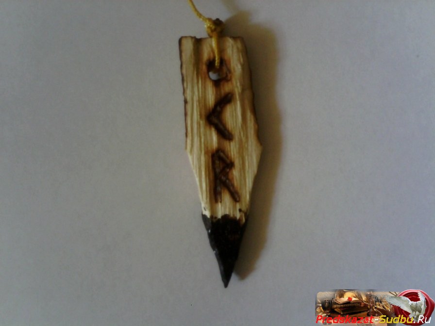 Процесс: Вырезаете заготовку примерно 3x4 см, вырезаете руны (Хотя, можно и выжечь, как в данном случае). Окрашиваете кончик кровью и покрываете его (кончик) жидкой канифолью (Можно использовать лак). Проделываете отверстие для нити (Думаю все знают, как это сделать. Но, на тот редкий случай, если в доме нет дрели или вы боитесь ею пользоваться после "Того самого случая с котом..." - не используйте гвоздь или шуруп, так можно расколоть амулет. Проще всего воспользоваться варварским методом и "Проковырять" отверстие отврёткой.