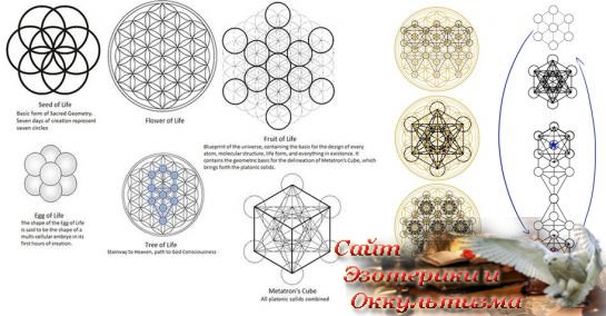 4 — Путем наложения/соединения все это образует единую взаимосвязанную структуру цветка жизни. И далее упрощается до формы круга — Творец, все и ничего.