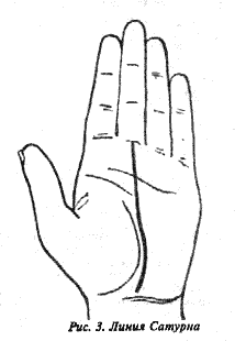 От среднего пальца, или Сатурна, идет линия Сатурна, которая прочерчивает всю ладонь и оканчивается в запястье. Так как она показывает судьбу жизни, то и называется "линией судьбы".