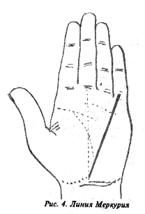 От малого пальца Меркурия идет линия Меркурия, которая также оканчивается в запястье.
