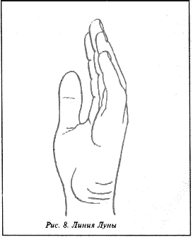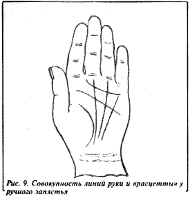 К этому присоединяется еще ряд горизонтальных линий у запястья, "расцетты" или "рестрикты", которые окружают руку у запястья многократно, как браслет (рис.9), и видная на рис.8 группа линий Луны.