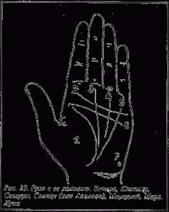2) тем, что два холма не отчетливо разделены, но соединились в одно изображение; 3) началом, формой и величиной отдельных соответственных холмам линий, или же граничащих главных линий ладони; наконец, 4) тем, что отдельные холмы имеют не одинаковое развитие.