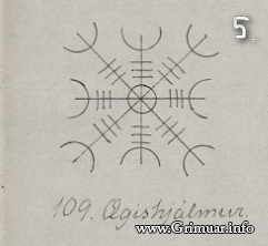 Надпись внизу на исландском «Berist á sér móti illum øndum» переводится, вероятно, как «Нанеси против злых духов».Также в исландских гримуарах встречается большое количество исконно христианских знаков, не подвергшихся какому-либо влиянию Северной Традиции. К примеру, довольно часто встречается тринитарная формула (Pater, Filius, Spiritus Sanctus – Отец, Сын, Святой Дух), использовавшаяся также для защиты от зла (8).